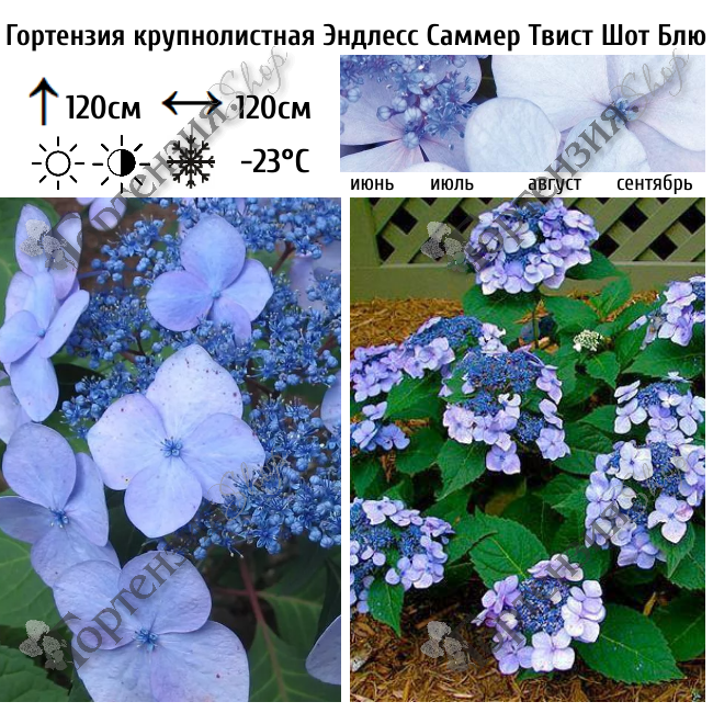 Гортензия крупнолистная Эндлес Саммер Твист Шот - цветущий кустарник высотой и шириной до 1,2 м.  Листва глянцевая тёмно-зелёная, осенью красно-бордовая. Побеги красные. Цветёт обильно всё лето на прошлогодних побегах и побегах текущего года.  Ажурные соцветия состоят из плодоносящих мелких цветков (в центре) и стерильных, более крупных  цветков. Соцветия диаметром до 15 см., в  зависимости от кислотности почвы могут быть розовыми или голубыми. Цветение с июня по август. Подходит для одиночных и групповых посадок а также для выращивания в контейнере.  На зиму требуется укрытие.