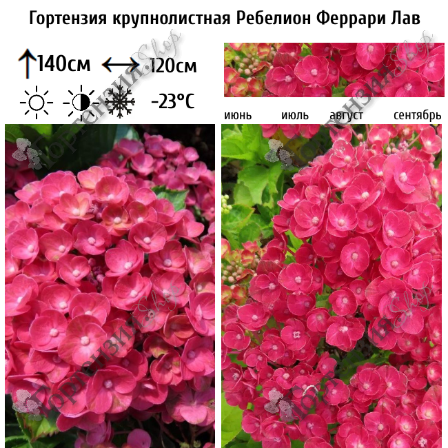 Гортензия макрофилла 'Rebellion® 'Ferrari Love' - элегантный листопадный, хорошо разветвленный кустарник с крепкими побегами, которые хорошо держат форму и не разваливаются под тяжестью соцветий. Вырастает примерно до 1,2-1,4 м в высоту и ширину. С июня по сентябрь образует большие шаровидные соцветия около 15 см, окрашенное от розовой до фиолетовой окраски в зависимости от кислотности почвы. Соцветия этого сорта примечательны своей изменчивостью от нежно-розового, который постепенно переходит в насыщенный малиново-розовый. Цветы хорошо сохраняют окраску и в полутени, так как прямые солнечные лучи могут вызвать ожоги листьев, а глубокая тень ослабляет цветение. Оригинатором гортензии крупнолистной Hydrangea macrophylla 'Rebellion® 'Ferrari Love' является ассоциация селекционеров Hydrangea Breeders Association (HBA) из Нидерландов.