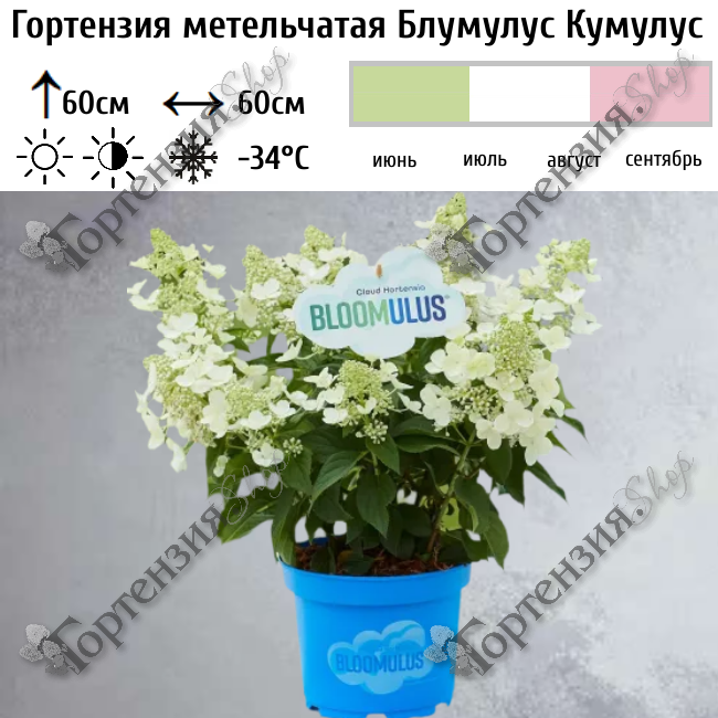 Hydrangea paniculata ‘Bloomulus Cumulus’ (Блумулус Кумулус) — воздушная классика, настоящий флагман серии, названный в честь кучевых облаков. Сорт Кумулус воздушная элегантность, словно утонченная балерина в мире гортензий. Её соцветия легкие, ажурные кружева, сотканные из изящных стерильных и большого количества фертильных цветков. Цветки в форме «блюдца», соцветия напоминают рыхлые облака. Цветки переливаются от лаймово-зеленого бутона к молочно-белому, далее раскрываются  чистейшим белым в течение лета  с переходом к нежнейшему кремово-розовому к концу сезона. Этот сорт подарит вашему саду ощущение простора, легкости и изысканной природной грации. Сорт создан для тех, кто устал от массивности и ищет в саду легкость и ажурность.