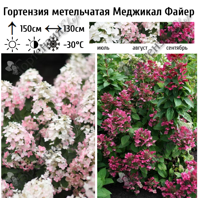 Гортензия метельчатая (Hydrangea paniculata) 'Меджикал Файер' - кустарник в высоту 150 -180 см. Стебли растение имеет крепкие и плотные. Они не прогибаются под существенным весом соцветий. Их длина может достигать 20 см. Соцветие состоит из множества небольшого размера цветков. Их окрас изменяется на протяжении всего цветения. Изначально появляются светло-розовые цветки. В середине лета они становятся насыщенного светло-красного оттенка. А осенью приобретают ярко-красный, а порой даже пурпурный оттенок. До момента появления первых бутонов, растение покрывается тёмно-зелёными листьями. Главной особенностью данного сорта является то, что гортензия растёт очень быстро.