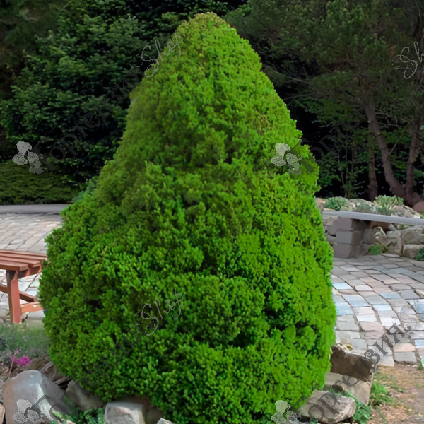 Ель сизая 'Коника' - хвойное карликовое дерево, высотой 2-3 м. диаметром 1-1,5 м. Крона: конусовидная. Хвоя ярко-зеленого цвета, мягкая, тонкая и короткая. Отношение к свету: свет. Почва cупесчаная, суглинистая.Зимостойкость: высокая, требует укрытия при первых солнечных лучах. Используется для альпинариев, подходит для небольших садов.