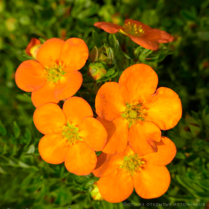 Цветки полумахровые, яркие, насыщенно-оранжевые, крупные, диаметром 5см, не выгорают по мере цветения.  Пятилисточник кустарниковый. Необычайно выносливый, сильно ветвящийся кустарник. Обильно цветёт с июня по сентябрь. Предпочитает солнце, полутень. Почва умеренно влажная, плодородная.