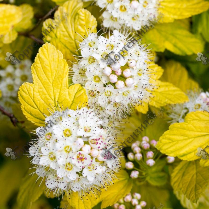 Пузыреплодник калинолистный Ангел Голд (PhysocarpusopulifoliusAngelGold) - отличается золотисто-желтыми листьями, слегка зеленеющими в середине лета. Кустарник высотой до 2,5 метров с раскидистыми слегка поникающими ветками. Крона куста сферической формы. Кора на старых ветках отслаивается полосками. Молодые побеги светложелтого цвета. Листья 5-10 см длиной при распускании желтого цвета, такая окраска сохраняется недолго, потом они зеленеют, осенью вновь приобретают золотистую окраску. Цветет мелкими белыми цветками, собранными в щитковидные соцветия, появляющиеся в начале июня. Плоды – острые листовки, собранные в щитки, созревают в августе-сентябре и долго сохраняются на кустах.