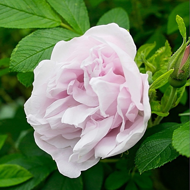 Куст раскидистый. Высота взрослого растения: 0,9-1 м. Диаметр кроны: 1-1,2м. Листья крупные, жесткие, морщинистые, зеленые, матовые. Цветки полумахровые, 6-7см в диаметре, белые с розовым или сиреневым оттенком, с приятным ароматом. Плоды алые, крупные, мясистые, съедобные. Зимостойкость высокая. Цветение: обильное в июне, продолжается волнами до морозов. Светолюбива, выносит легкое затенение. Почвы предпочитает плодородные, дренированные, увлажненные.