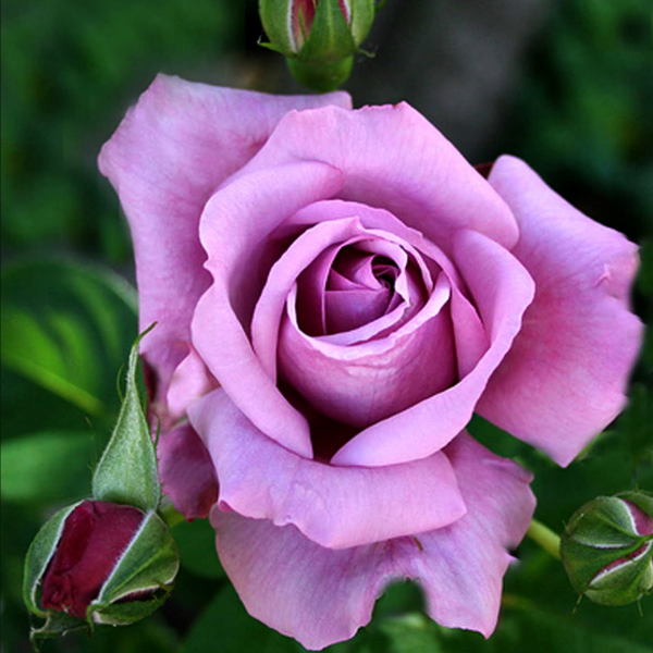 Роза чайно-гибридная Blue Moon  (или Голубая луна) -  названа так из-за оригинальной окраски лепестков бутонов – нежно-голубого цвета. Бутоны – крупные, после полного распускания цветок  в диаметре может быть до 12 см. Характерной особенностью этого сорта является изменение окраски лепестков бутонов в зависимости от места выращивания. При выращивании этого цветущего кустарника в полутени или тени окрас лепестков становится розоватым. Если же солнца на участке, где растет эта роза, достаточно, то окраска лепестков становится лиловой или голубой. Куст прямостоячий, мощный, высотой  100см, листва зеленая, глянцевая.
