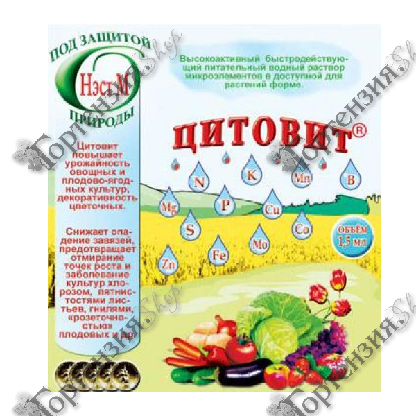 Цитовит - Питательный раствор, предназначен для замачивания семян и подкормки любых растений (опрыскивание и полив). Усваивается без потерь. Увеличивает запас жизненных сил и выносливость растений в период вегетации и при перезимовке. Ускоряет прорастание семян, рост и развитие растений, повышает устойчивость к неблагоприятным условиям : болезням паразитарного и непаразитарного характера, различным пятнистостям листьев, "розеточность" плодовых, гнили и др. болезни. Предотвращает отмирание точек роста, снижает опадение завязи.